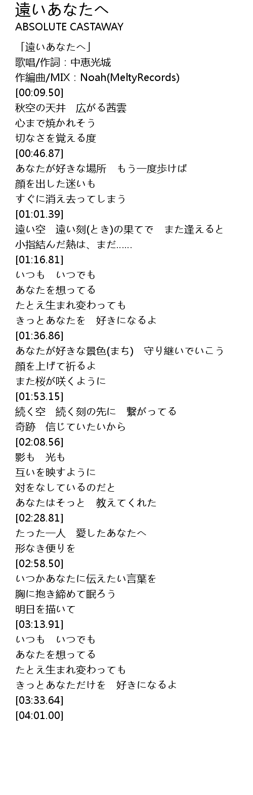 | [01:01.40] | 遠い空 遠い刻(とき)の果てで また逢えると |