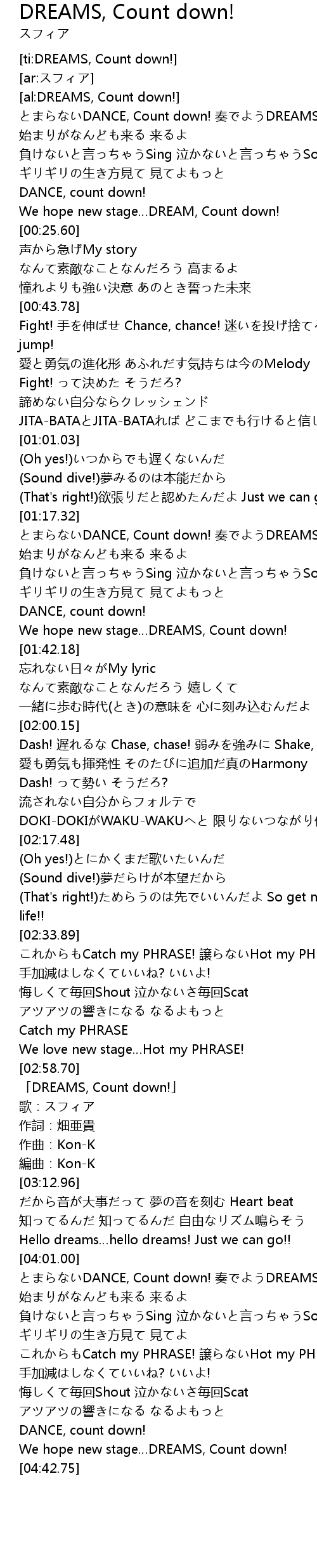 | [03:00.34] | 「DREAMS, Count down!」 |