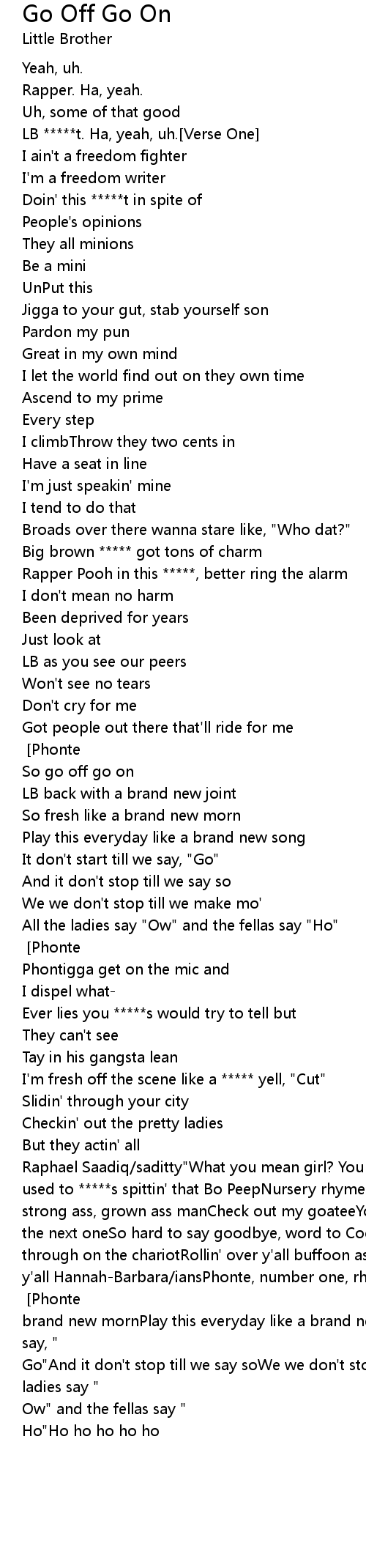 Raphael Saadiq/saditty"What you mean girl? You don't even know me.You probably used to *****s spittin' that Bo PeepNursery rhyme *****t can't compare to this strong ass, grown ass manCheck out my goateeYou missed the best oneI'm off to the next oneSo hard to say goodbye, word to CochiseMe and Big Pooh comin' through on the chariotRollin' over y'all buffoon ass *****sCartoon ass *****s, y'all Hannah-Barbara/iansPhonte, number one, rhyme animal candidateAnd I'm out[Chorus] [Phonte]So go off go onLB back with a brand new jointSo fresh like a brand new mornPlay this everyday like a brand new songIt don't start till we say, "