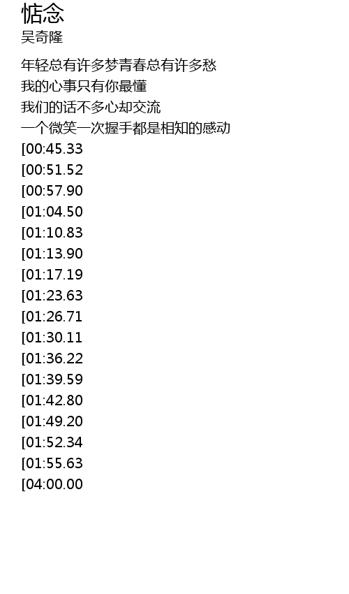 | [03:47.45][01:55.63] | 有这样浓醇不变的友情人生就不寂寞 |
