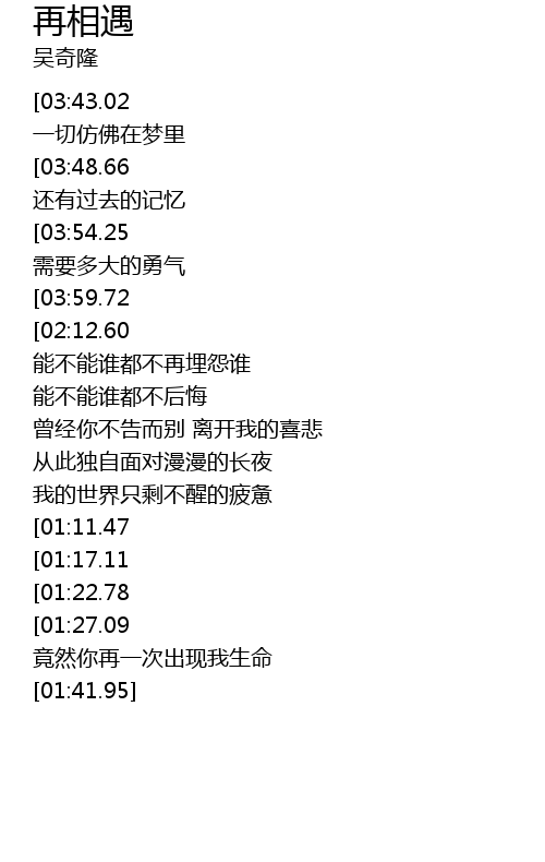 | [04:05.76][03:43.02][03:20.56][02:52.16][01:44.68][00:14.25] | 再相遇 一切仿佛在梦里 |