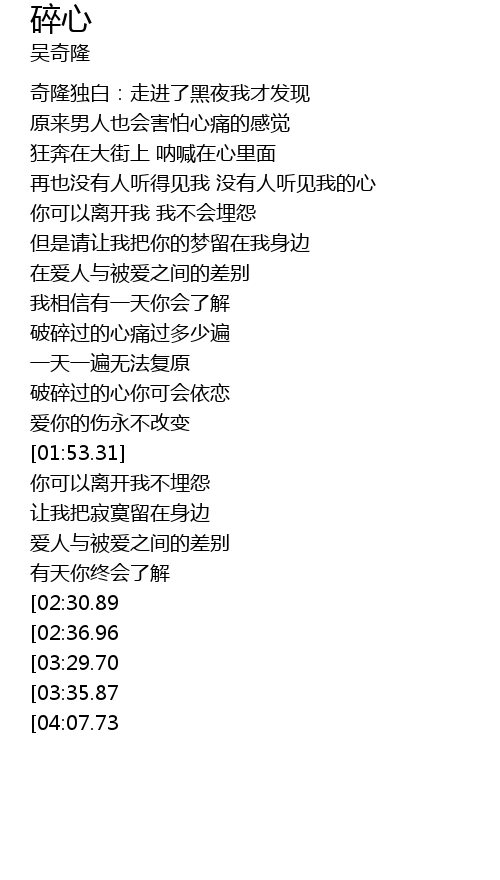 | [03:41.49][03:29.70][02:43.05] | 破碎过的心你可会依恋 |