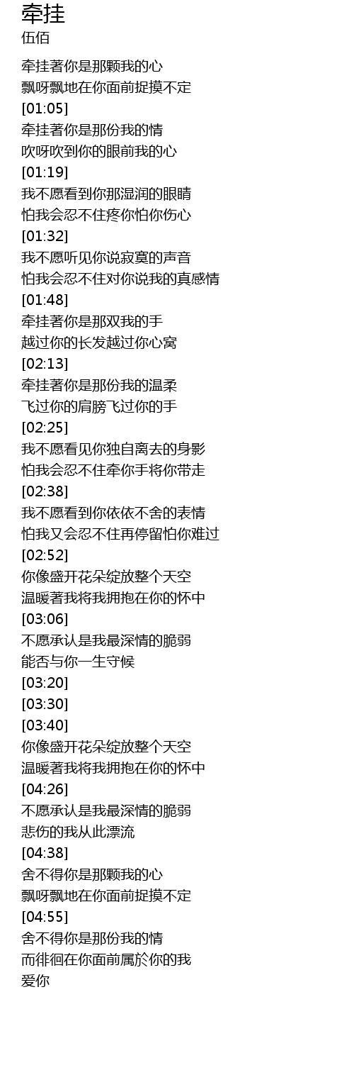 | [01:07] | qiān guà zhe nǐ shì nà fèn wǒ de qíng |