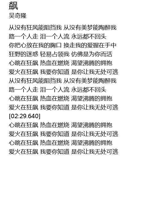 | [02:53.450] | ài huǒ zài kuáng biāo wǒ yào nǐ zhī dào shì nǐ ràng wǒ wú chǔ kě táo |
