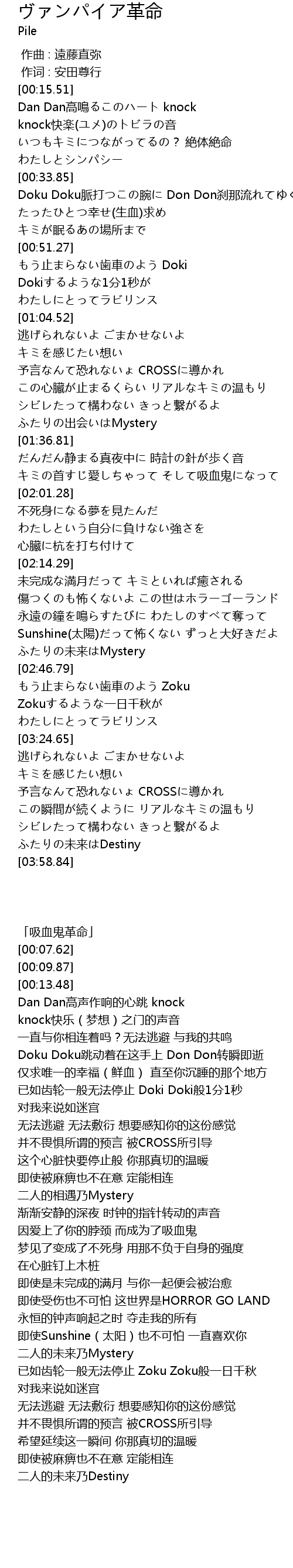 | [00:38.59] | Doku Doku脈打つこの腕に Don Don刹那流れてゆく |