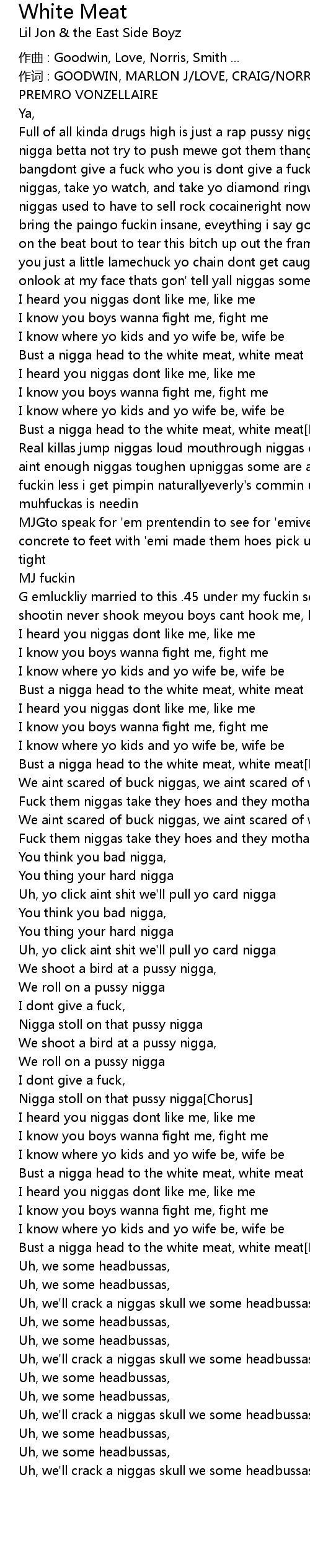 | Bust a nigga head to the white meat, white meat[Lil Jon] | |