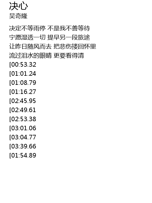 | [02:15.76][00:53.32] | 决定不等天亮 不是我急着离开 |