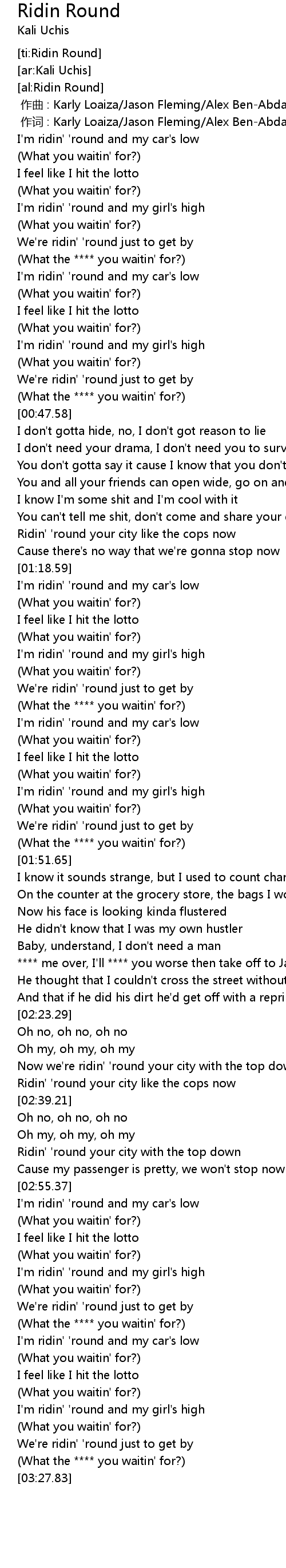 | [00:31.42] | I' m ridin' ' round and my car' s low |