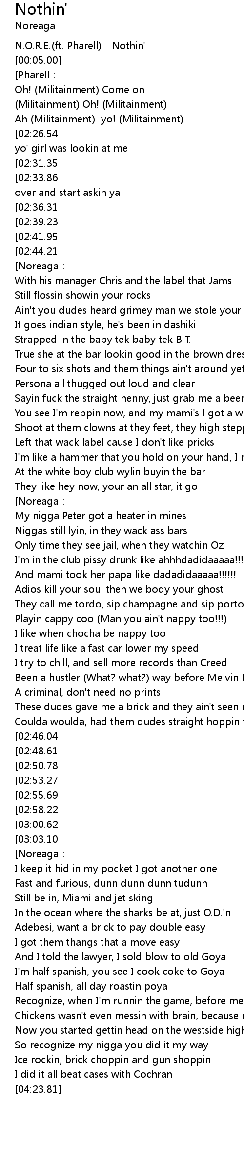 | [00:00.00] | N.O.R.E.(ft. Pharell) - Nothin' |