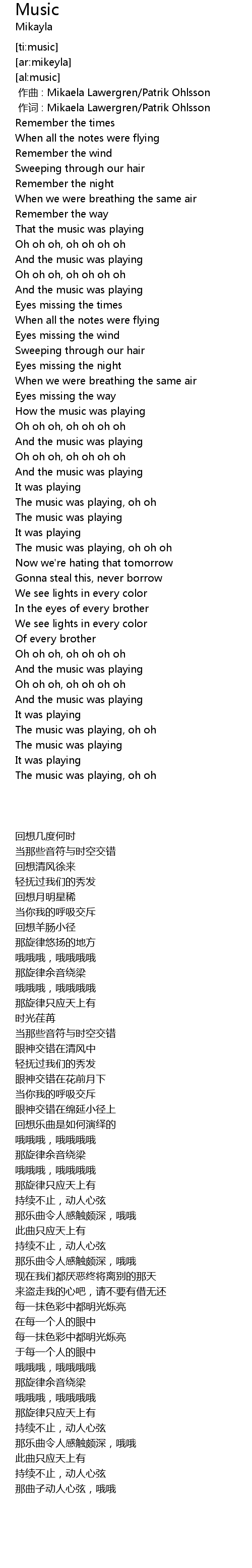 | [00:00.00] | 作曲 : Mikaela Lawergren/Patrik Ohlsson |