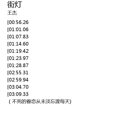 | [03:29.22][02:59.94][01:38.12] | 街灯可见证 这对我对你最思念 |