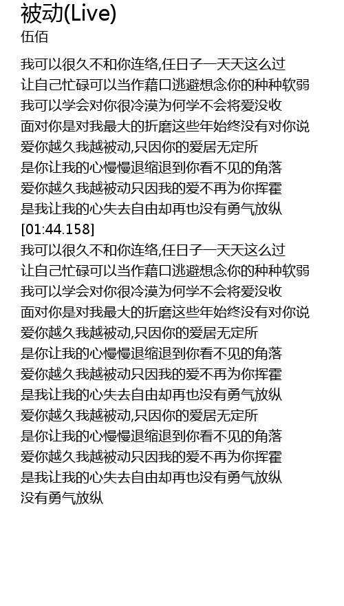 | [02:45.320] | 爱你越久我越被动,只因你的爱居无定所 |