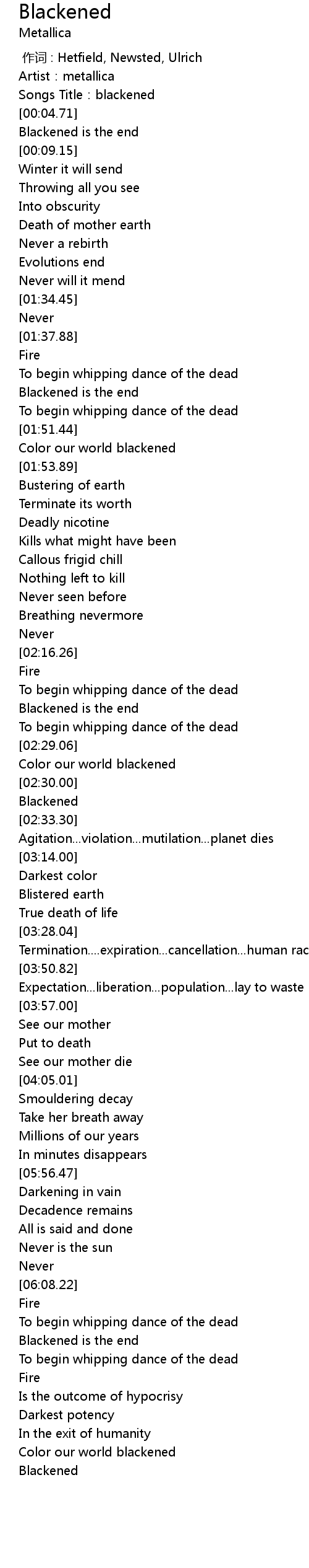 | [00:00.00] | 作词 : Hetfield, Newsted, Ulrich |