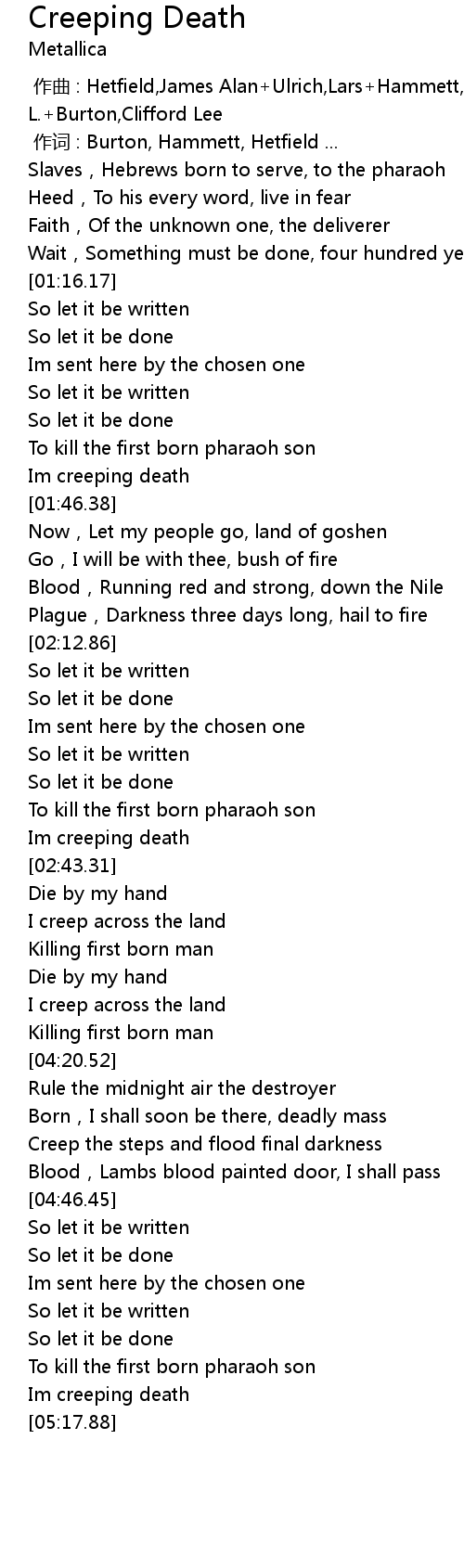 | [00:00.00] | zuò qǔ : Hetfield, James Alan Ulrich, Lars Hammett, Kirk L. Burton, Clifford Lee |