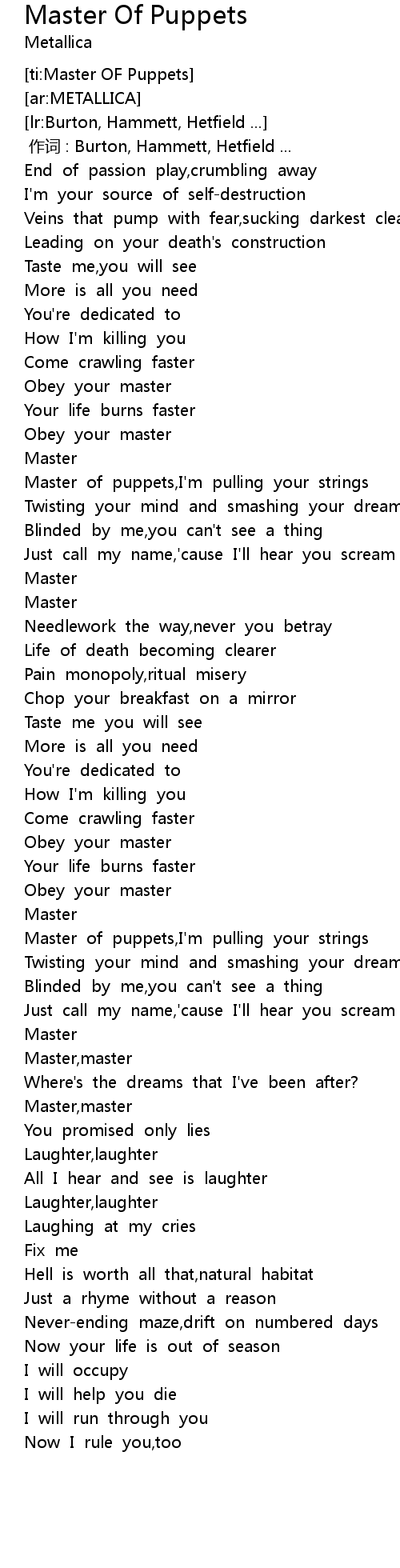 | [01:47.544] | Master of puppets, I' m pulling your strings |