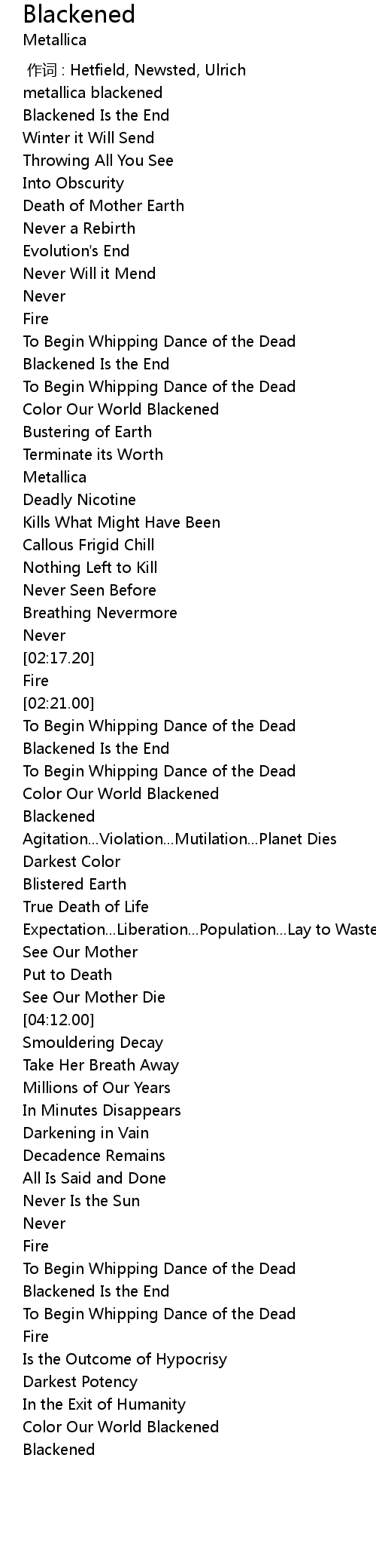 | [00:00.00] | 作词 : Hetfield, Newsted, Ulrich |