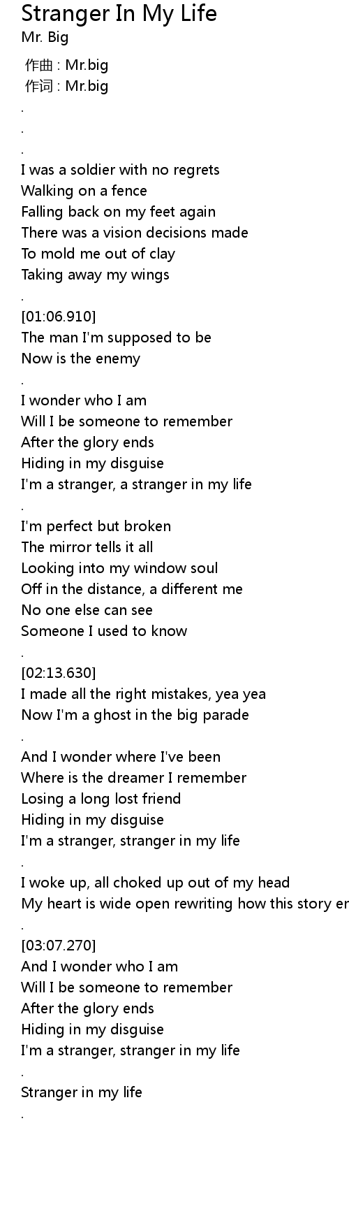 | [02:41.890] | I'm a stranger, stranger in my life |