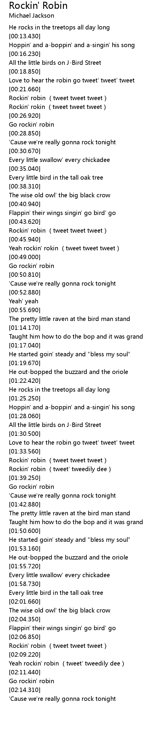 | [02:07.850] | Rockin' robin (tweet tweet tweet) |