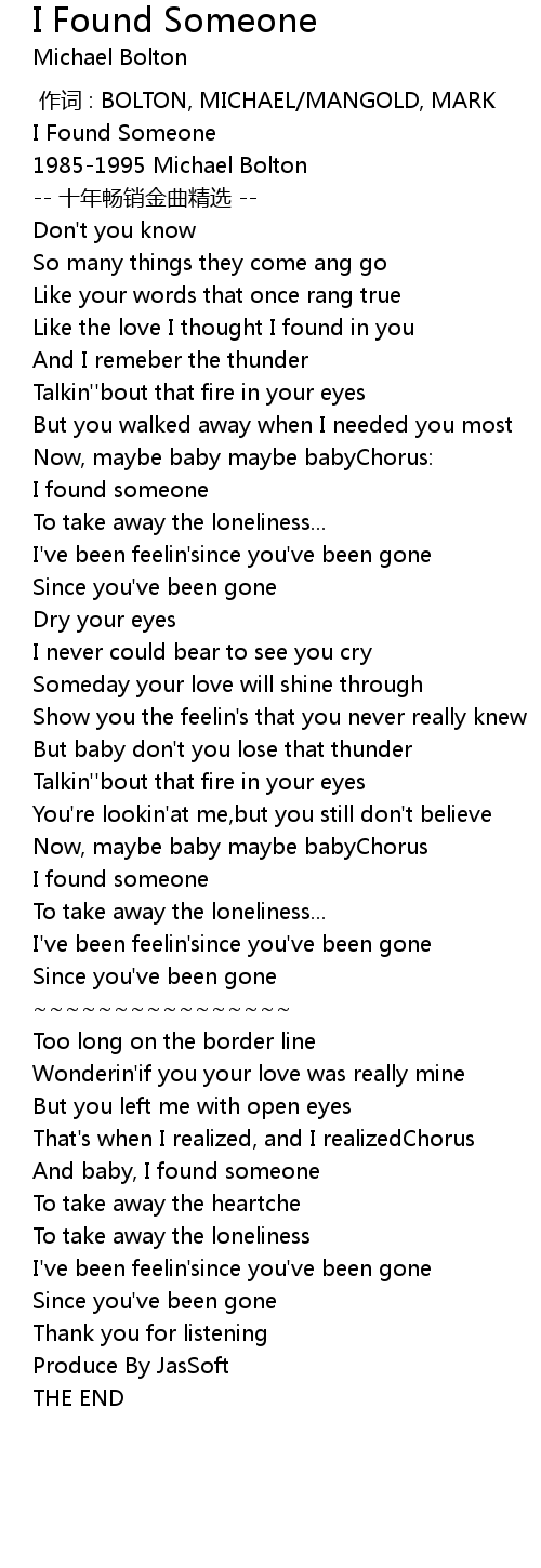 | [03:06.91] | And baby, I found someone |