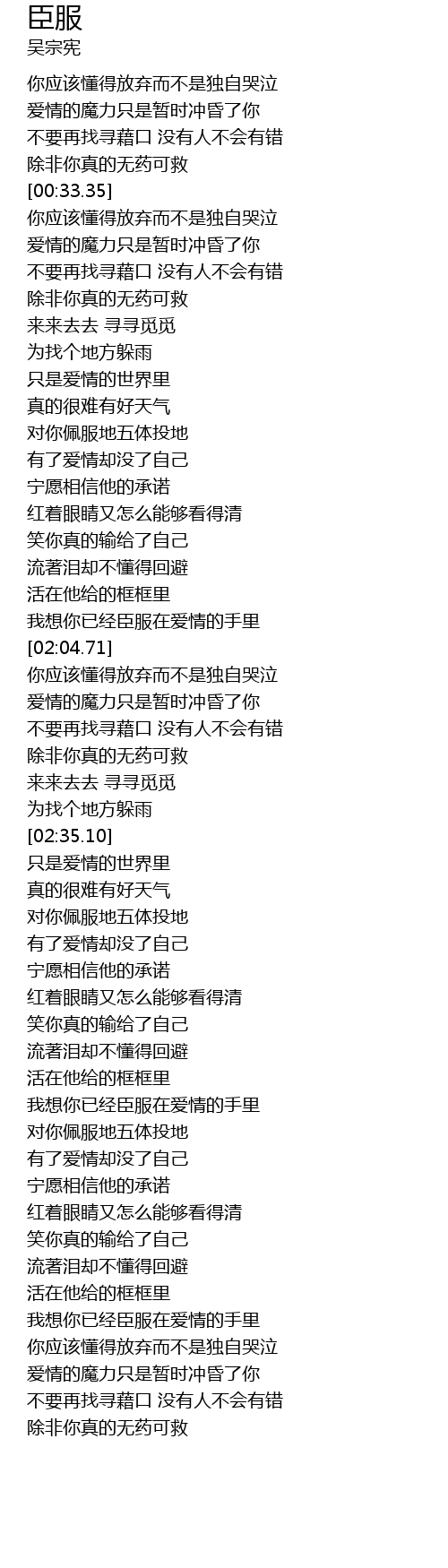 | [03:48.49] | 我想你已经臣服在爱情的手里 |