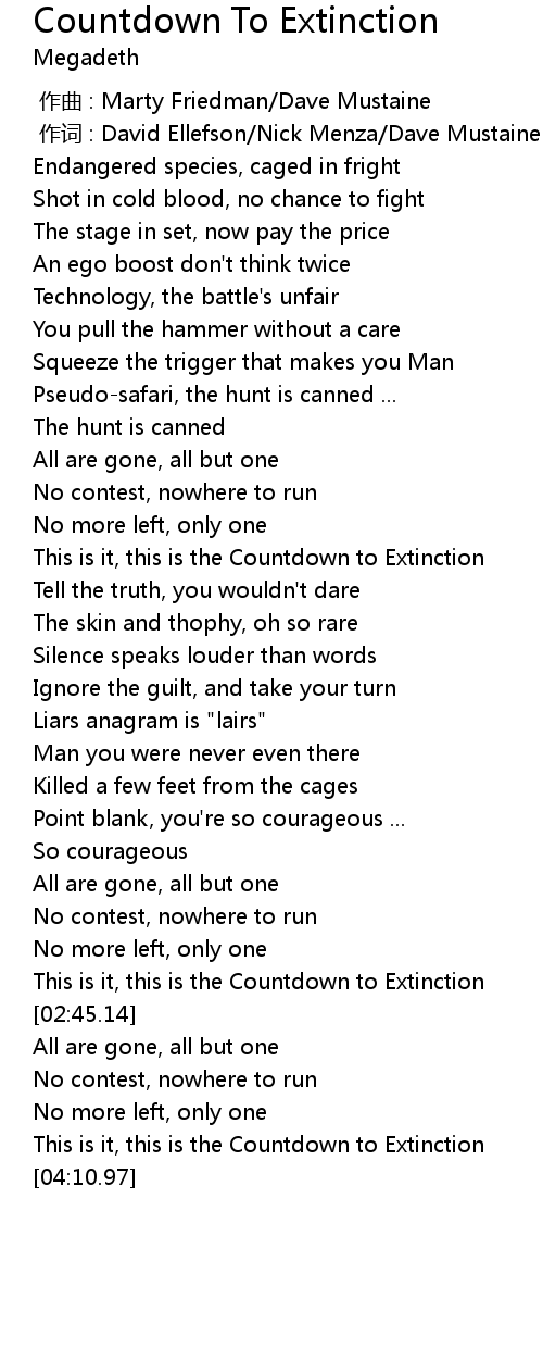 | [01:19.88] | This is it, this is the Countdown to Extinction |
