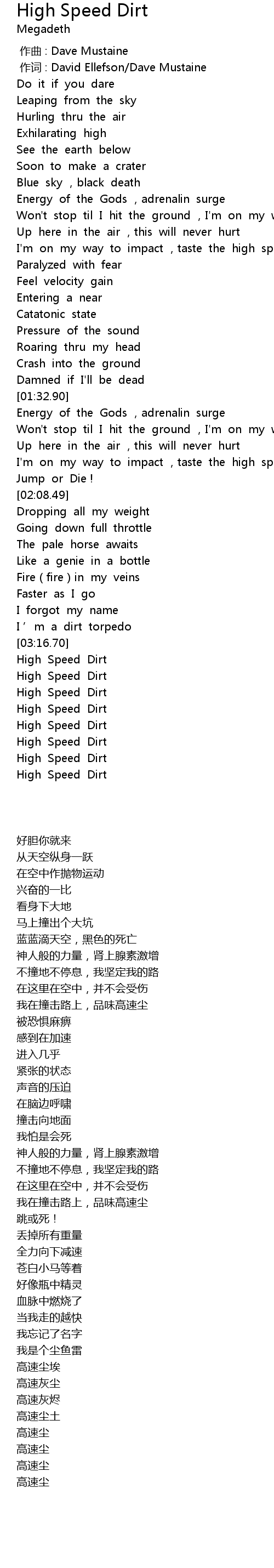 | [00:01.00] | 作词 : David Ellefson/Dave Mustaine |