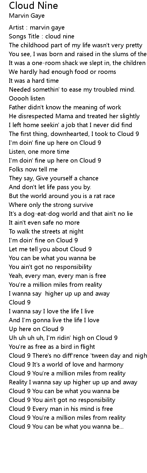 | [01:41.28] | I'm doin' fine on Cloud 9 |