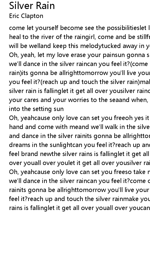 Oh, yeah, let my love erase your painsun gonna shine, gonna shine againthen we'll dance in the silver raincan you feel it?(come on and dance in the silver rain)its gonna be allrighttomorrow you'll live your dreams in the sunlightcan you feel it?(reach up and touch the silver rain)make you feel brand newthe silver rain is fallinglet it get all over yousilver raincome, come with mecast your cares and your worries to the seaand when, the day is goneand will dance into the setting sun |