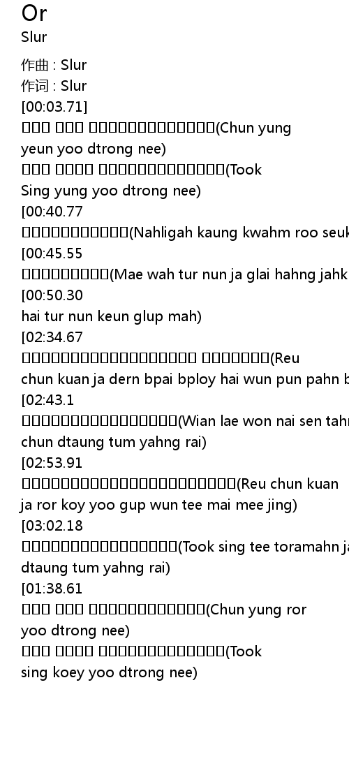 | [03:32.39][02:34.67][00:58.63] | Reu chun kuan ja dern bpai bploy hai wun pun pahn bplian |