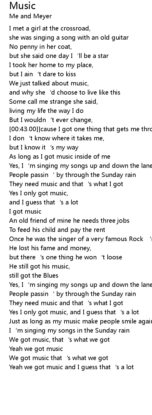 | [02:30.00] | Yes I only got music, and I guess that' s a lot |