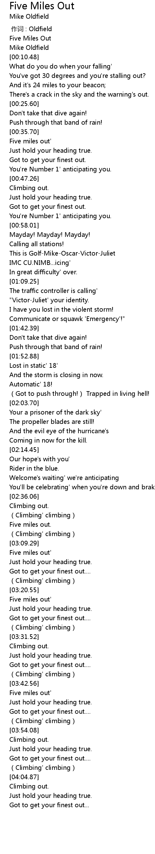| [03:10.25] | Five miles out' |