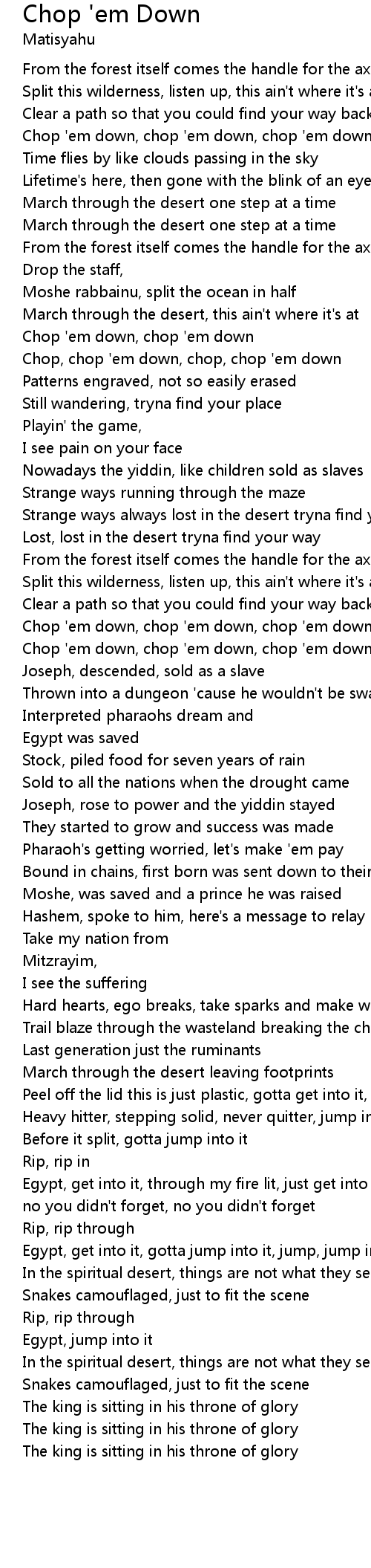 Chop 'em down, chop 'em down, chop 'em down, chop 'em down |