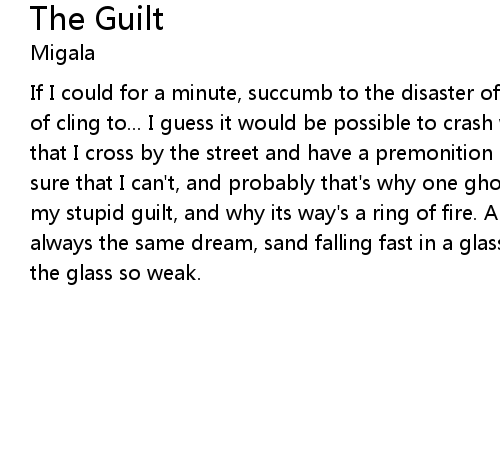 | If I could for a minute, succumb to the disaster of everyday, to let me go, let of cling to... I guess it would be possible to crash with one of the strangers that I cross by the street and have a premonition of happiness. But now, it's sure that I can't, and probably that's why one ghost comes every night to rock my stupid guilt, and why its way's a ring of fire. And when I finally sleep it's always the same dream, sand falling fast in a glass bell. The sand very clean, the glass so weak. |