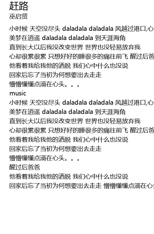 | [01:24.18] | 小时候 天空没尽头 daladala daladala 风越过港口,心在飘 美梦在逍遥 daladala daladala 到天涯海角 |