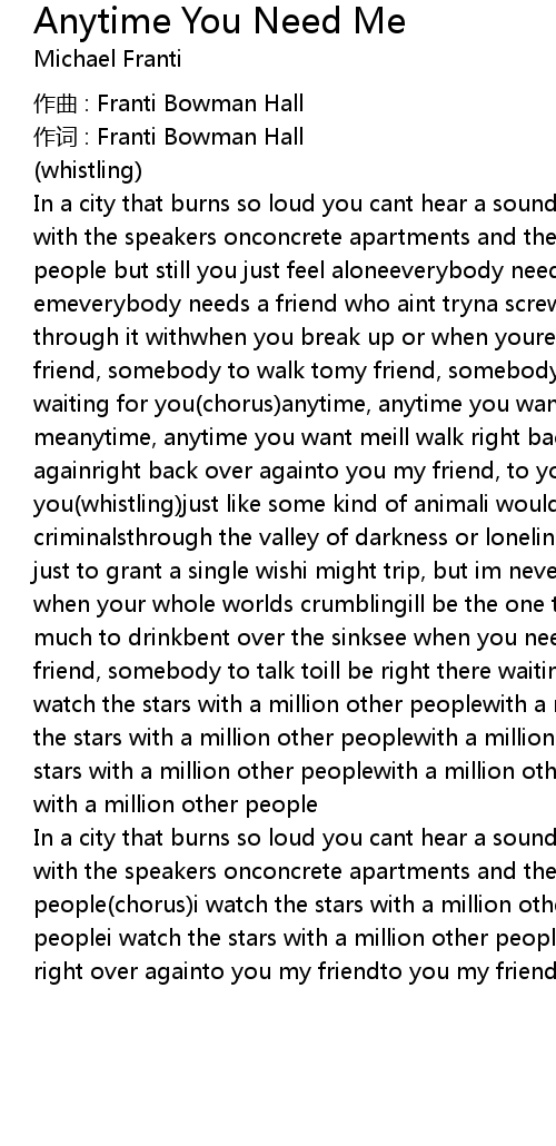 | In a city that burns so loud you cant hear a sound, the whole world drives by with the speakers onconcrete apartments and the windowswith a million other people but still you just feel aloneeverybody needs a friend just to listen to emeverybody needs a friend who aint tryna screw emeverybody needs a friend to go through it withwhen you break up or when youre falling in lovewhen you need a friend, somebody to walk tomy friend, somebody to talk toill wait right there waiting for you chorus anytime, anytime you want meanytime, anytime you need meanytime, anytime you want meill walk right back over againright back over againright back over againto you my friend, to you my friend, to you whistling just like some kind of animali would run through a jungle of criminalsthrough the valley of darkness or lonelinessfly across the great abyss just to grant a single wishi might trip, but im never stumblingim right there when your whole worlds crumblingill be the one to pick you up when youve had too much to drinkbent over the sinksee when you need a friendsomebody to walk tomy friend, somebody to talk toill be right there waiting for you chorus cause i watch the stars with a million other peoplewith a million other peoplei watch the stars with a million other peoplewith a million other peoplei watch the stars with a million other peoplewith a million other peoplei watch the stars with a million other people | |