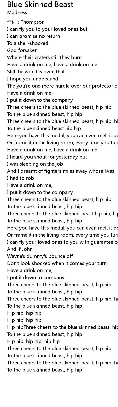 | Hip hipThree cheers to the blue skinned beast, hip hip | |