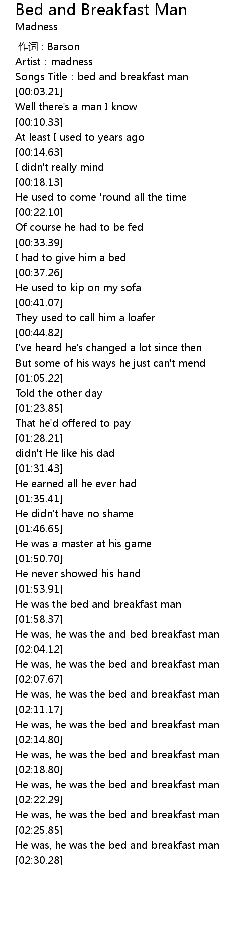 | [02:23.60] | He was, he was the bed and breakfast man |