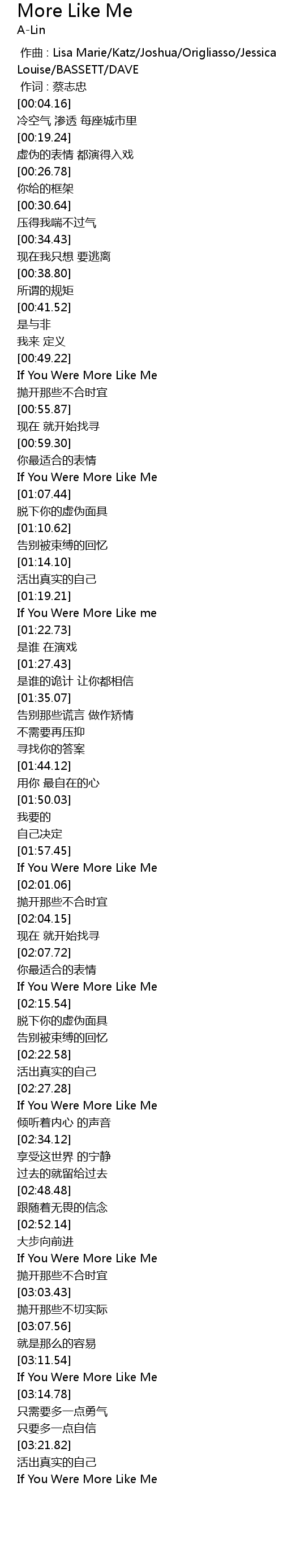 | [00:00.00] | 作曲 : Lisa Marie/Katz/Joshua/Origliasso/Jessica Louise/BASSETT/DAVE |