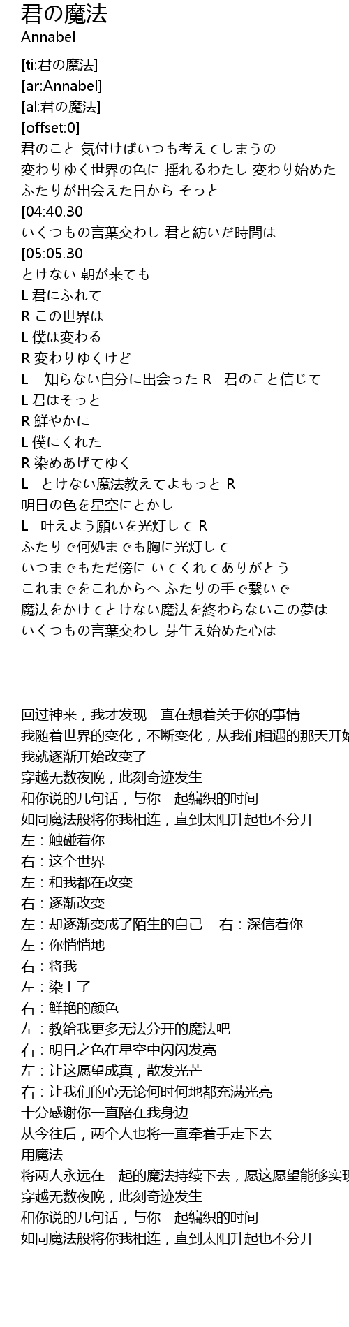 | [04:28.55] | 用魔法 将两人永远在一起的魔法持续下去,愿这愿望能够实现 |
