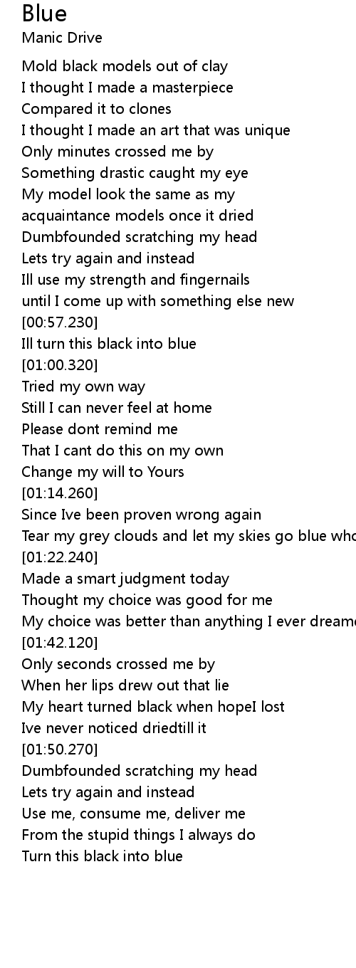[01:16.880] Tear my grey clouds and let my skies go blue who who who who who