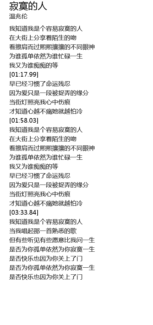 | [03:51.17] | wǒ zhī dào wǒ shì gè róng yì jì mò de rén |