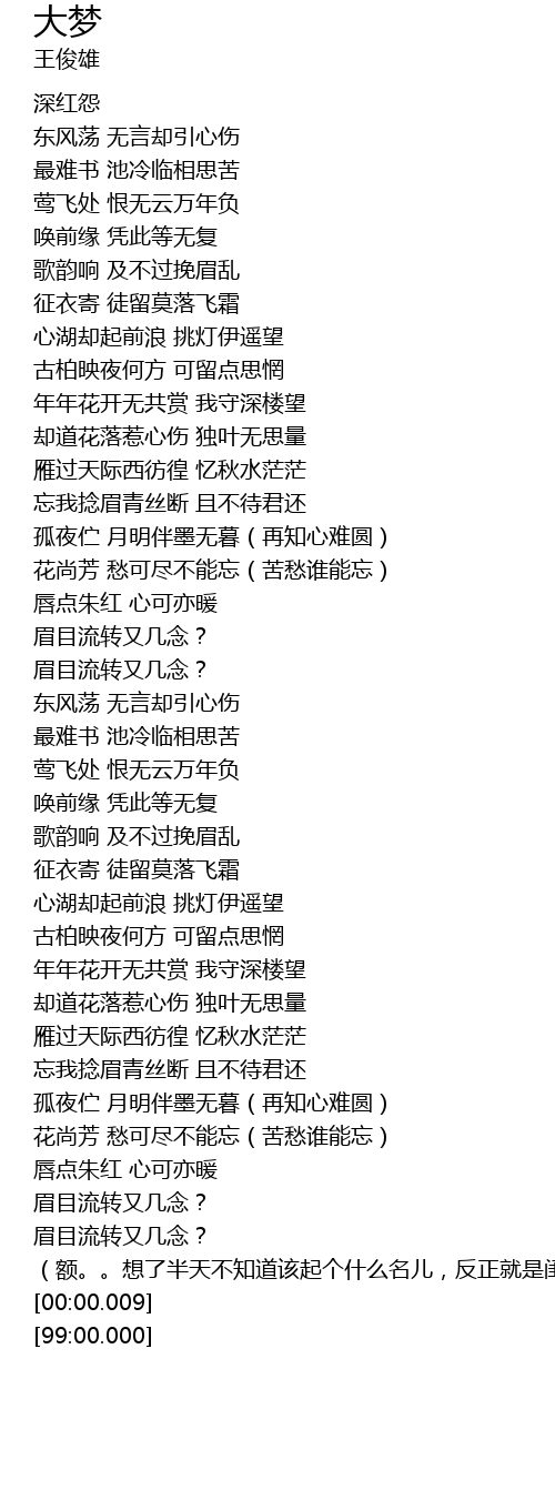 | [04:35.51] | (额。。想了半天不知道该起个什么名儿,反正就是闺怨的,什么深红怨之类的) |