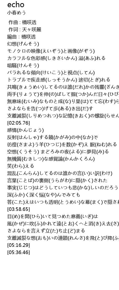 | [01:12.64] | 共鳴(きょうめい)してるのは誰(だれ)かの残響(ざんきょう) |