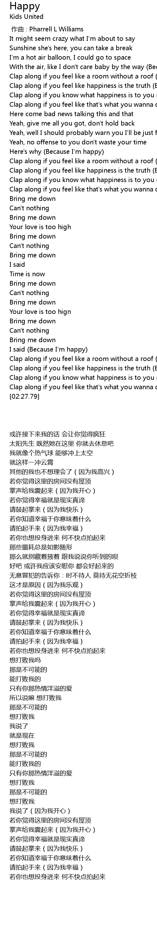 | [02:12.19] | Clap along if you know what happiness is to you (Because I'm happy) |