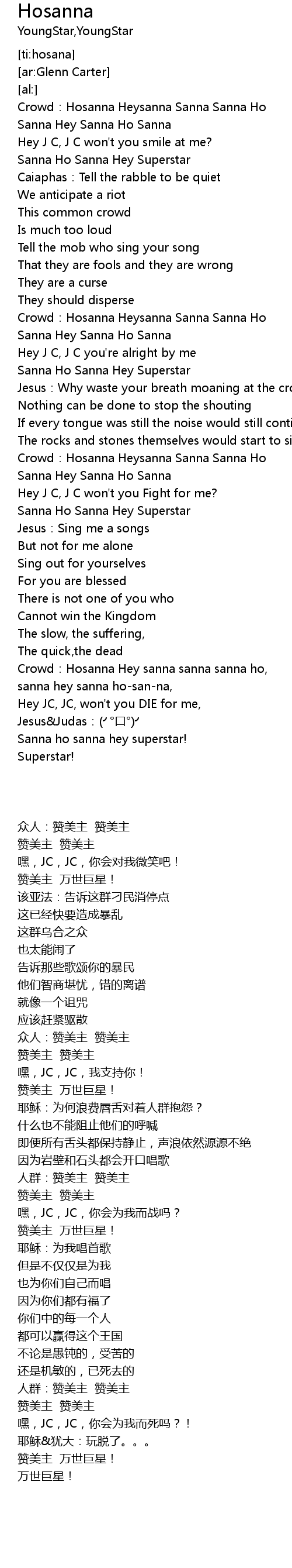 | [02:19.96] | Crowd: Hosanna Hey sanna sanna sanna ho, |