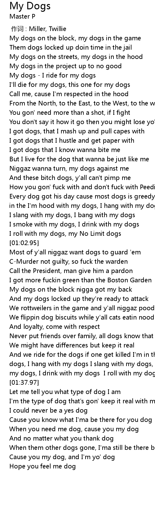 | [01:35.79] | And we ride for the dogs if one get killed I'm in the hood with my dogs, I hang with my dogs I slang with my dogs, I bang with my dogs I smoke with my dogs, I drink with my dogs I roll with my dogs, my No Limit dogs |