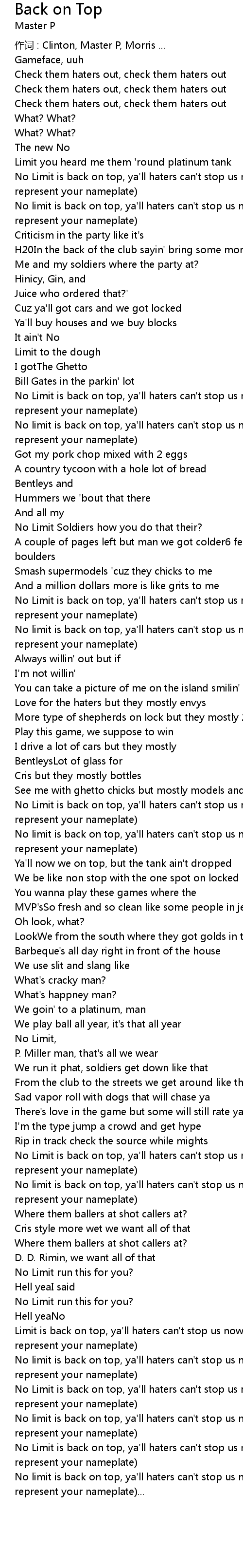 | No limit is back on top, ya'll haters can't stop us now(Turn your Gameface, represent your nameplate)... |