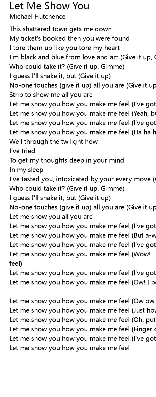 | Let me show you how you make me feel Just how you help me feel | |