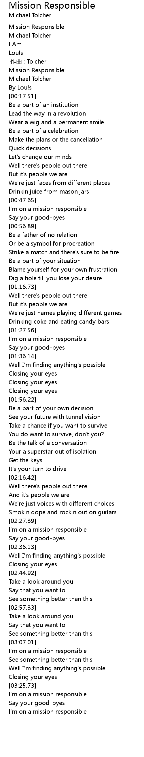 | [00:48.05] | I'm on a mission responsible |