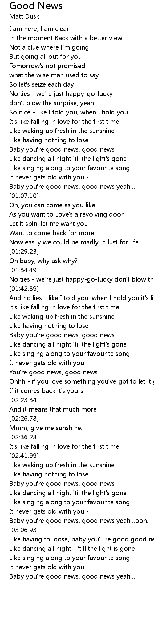| [03:10.31] | Like having to loose, baby you’re good good news |